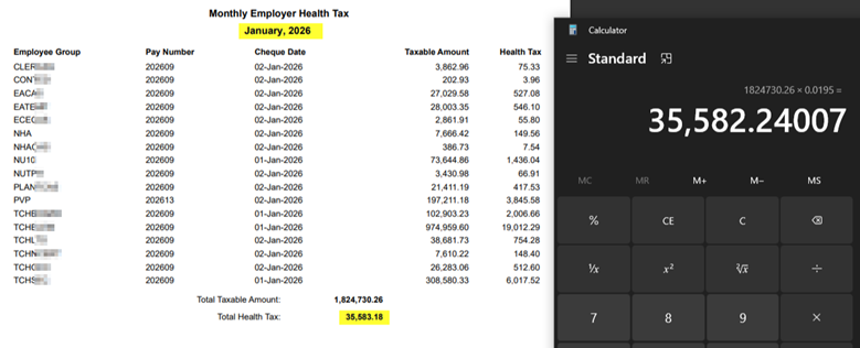 This article aims to address the concern that users may have when the Employer Health Tax Monthly Report is run, and the Total Health Tax varies from the Total Taxable Amount * EHT Rate slightly, often by a dollar or two.